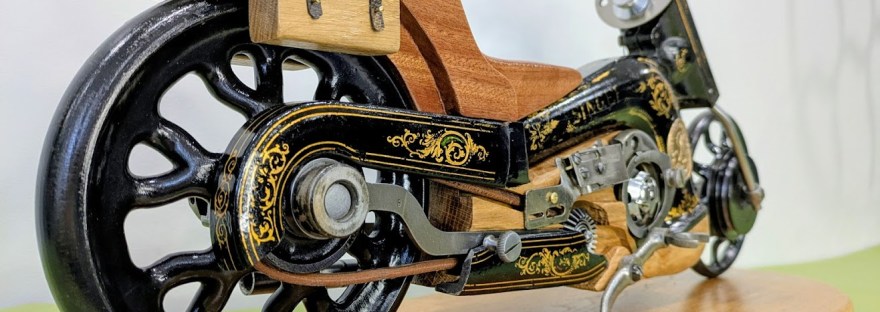 C'est notre 5ème moto réalisée avec une machine à coudre. La machine utilisée était déjà fort belle, la création n'en est que plus unique, c'est un petit bijou. Comme à l'accoutumée, toutes les pièces métalliques proviennent de machines à coudre, nous y avons rajouté le bois et quelques vis. Le bois a été sculpté et… Lire la suite La moto Singer vintage