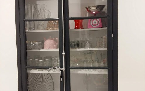 Un bon coup de peinture , des planches pour les étagères et du plexiglas pour remplacer les vitres….et vous voilà avec une superbe vitrine personnalisée.