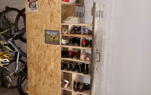 Avec quelques planches d’OSB et de coffrage , une ancienne porte d’atelier et des roulettes, voici un meuble qui met vos chaussures à l’abri de la poussière et les laisse à portée de main.