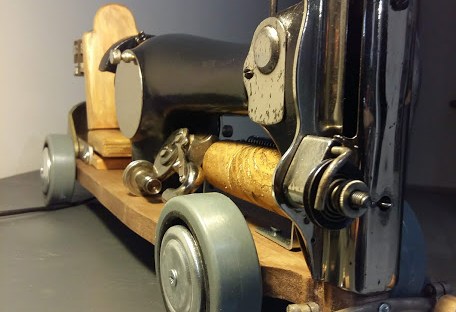 A mi chemin entre la voiture de sport et…le tracteur, le bolide est composé d’un corps de machine à coudre, de diverses pièces métalliques mais aussi de bois