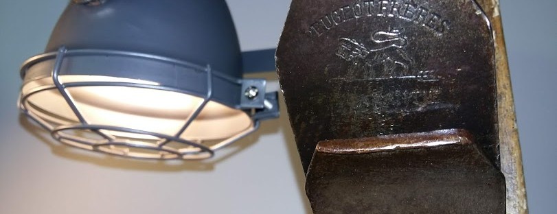Cet outil est déjà fort joli à lui seul mais pour le rendre fonctionnel et souligner son style vintage, un spot industriel et une petite bassine en zinc ont été rajoutés, le tout fixé sur un plateau de hêtre.