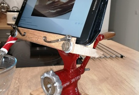 Cet ancien hachoir à viande retourné sert de base au support à tablette et peut même accueillir un livre puisque 2 ergots mobiles tiennent les pages ouvertes.