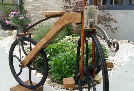 Alors pour fêter cet événement et l’associer à l’histoire de notre ville, nous avons entrepris de reproduire le Vélocipède avec des pièces de machine à coudre ancienne et du bois recyclé.