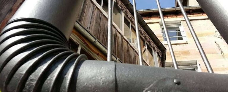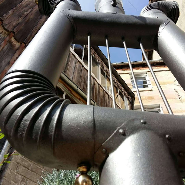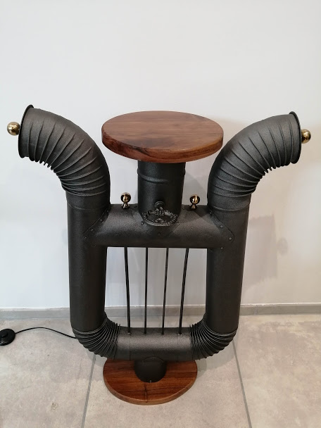 Crée dans un style musico-industriel. cette lampe a été confectionnée avec une lyre de cheminée ancienne en tubes rivetés avec boules de cuivre aux extrémités et une clé de fermeture de fumée.