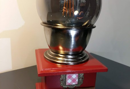 A partir d’un vieux moulin à café auquel nous avons retiré le mécanisme de broyage, nous avons créé cette petite lampe toute mignonne.