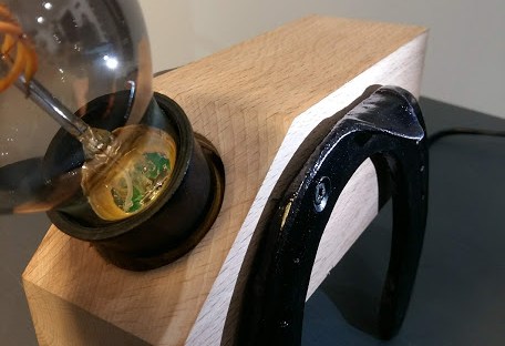 Ce bloc de hêtre au toucher tout doux, encadré par 2 véritables fers à cheval est une petite lampe originale et unique.