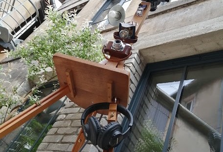 Nous avons chiné un chevalet de peintre en bois auquel nous avons ajouté une tablette en chêne(taillée dans une vieille table) et nous avons associé les objets entre eux de façon la plus harmonieuse et cohérente possible.