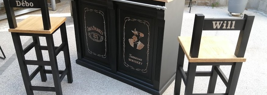 La commande: Modifier le bar sur le thème « Jack Daniel’s », transformer les 2 tabourets en chaises de bar et les personnaliser avec les prénoms des heureux destinataires de ce cadeau.