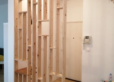 Comment marquer la séparation entre 2 pièces tout en laissant passer la lumière et ceci, de façon moderne….avec une cloison ajourée en bois recyclé.