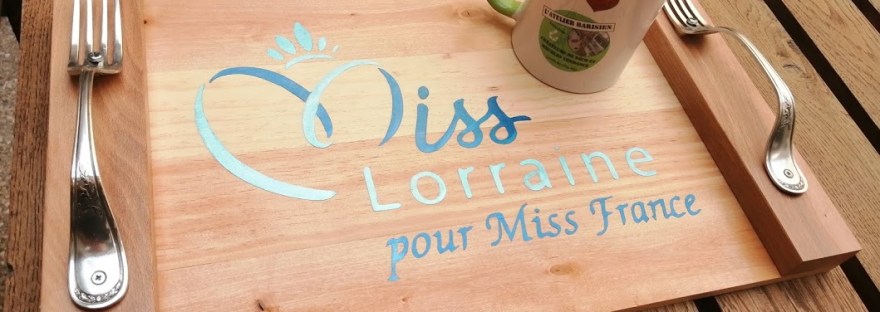 Le plateau, en bois recyclé, est orné du logo en couleur « Miss Lorraine pour Miss France » et ses poignées sont des couverts en argent ciselés.