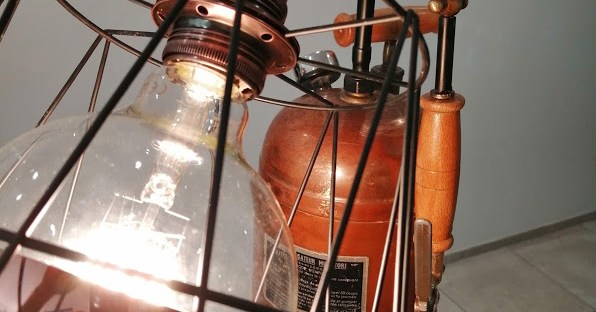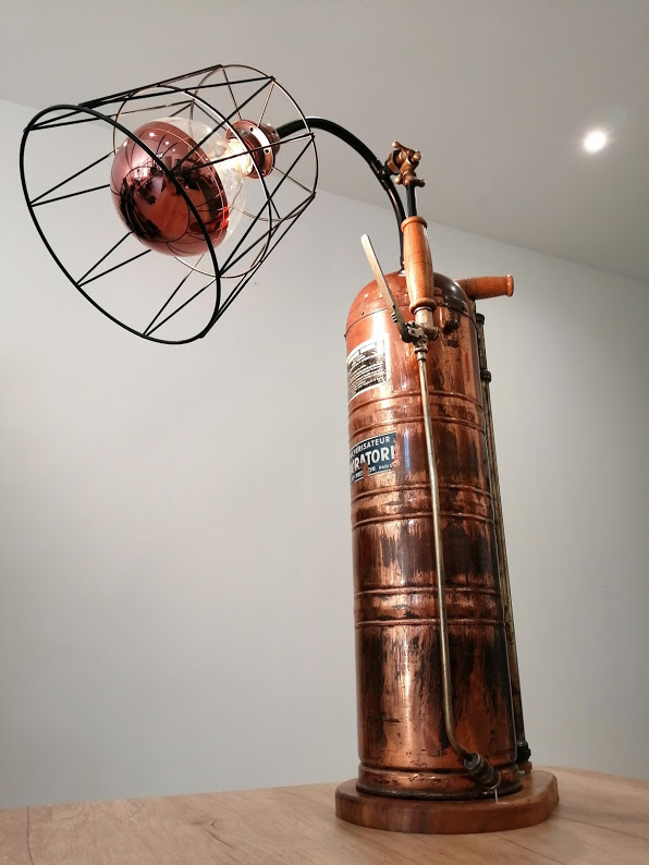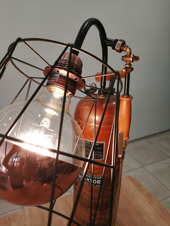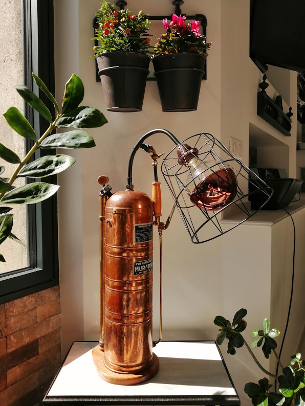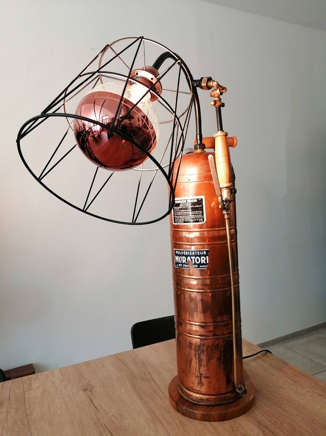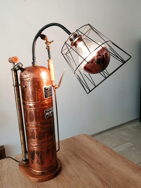 Un client nous a amené un ancien pulvérisateur en cuivre avec le projet de le transformer en lampe de bureau.