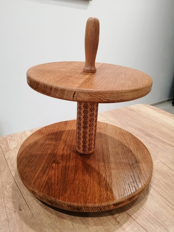 En bois recyclé( chêne), raboté, poncé, vernis et recouvert d’une couche de protection pour plan de travail, l’élément central est un rouleau à pâtisserie.
