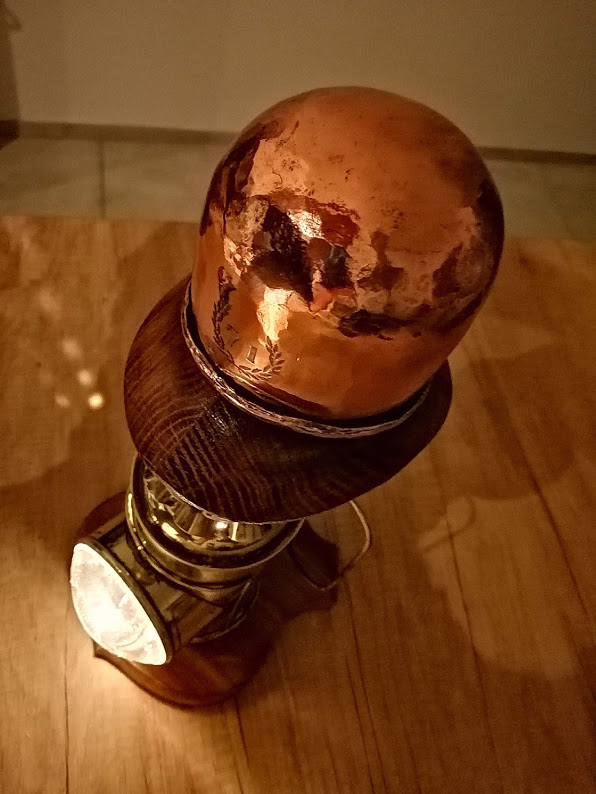 Voilà, il ne manquait plus qu’à lui remettre la lumière. Pas de pétrole ni d’huile de baleine, nous lui avons adapté une ampoule LED G9 derrière sa grosse loupe.