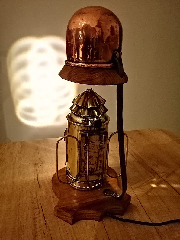 Puis, quand nous pensons à la police, nous pensons uniforme et donc couvre-chef. Fin du 19e ou début du 20e siècle, les policemen new yorkais portaient un casque, nous en avons reproduit un …..avec une louche en cuivre rose et du bois recyclé.