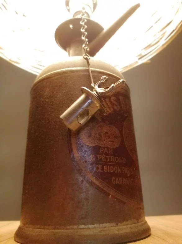 Nous vous avions présenté il y a quelques temps, la lampe à pétrole constituée d’un ancien bidon en métal sur lequel nous avions posé un abat-jour recouvert de grillage à poule.