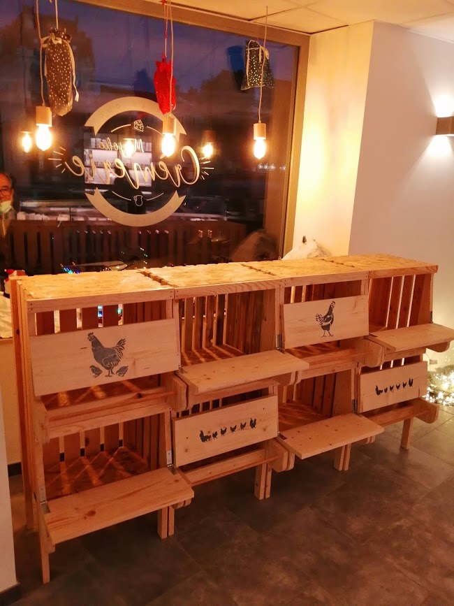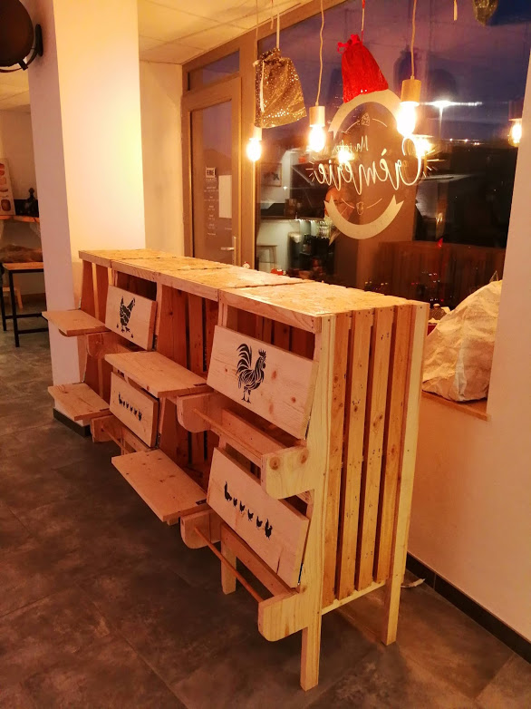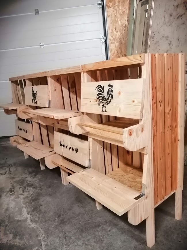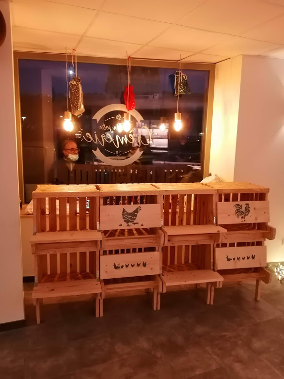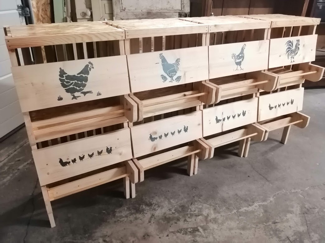En bois recyclé et OSB, ces pondoirs permettent le stockage et la présentation des produits et, s’ils sont vides… hop on referme et on admire les dessins de poules et autres poussins.
