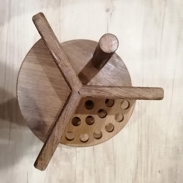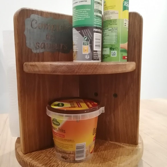 Créé en chêne recyclé verni, il peut accueillir sel, poivre ou aromates sur les étagères, les tubes à épices de La fée-tout sur l’étagère percée mais également le rouleau d’essuie-tout.