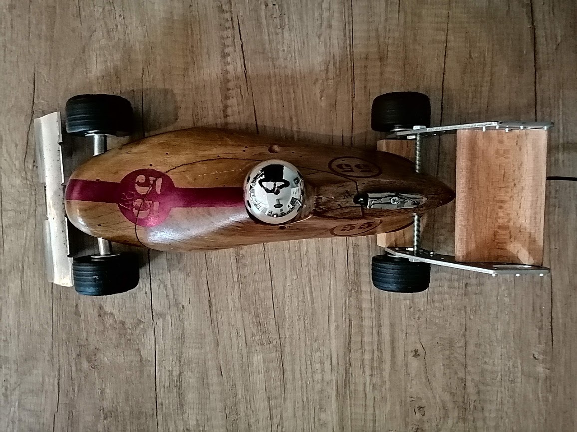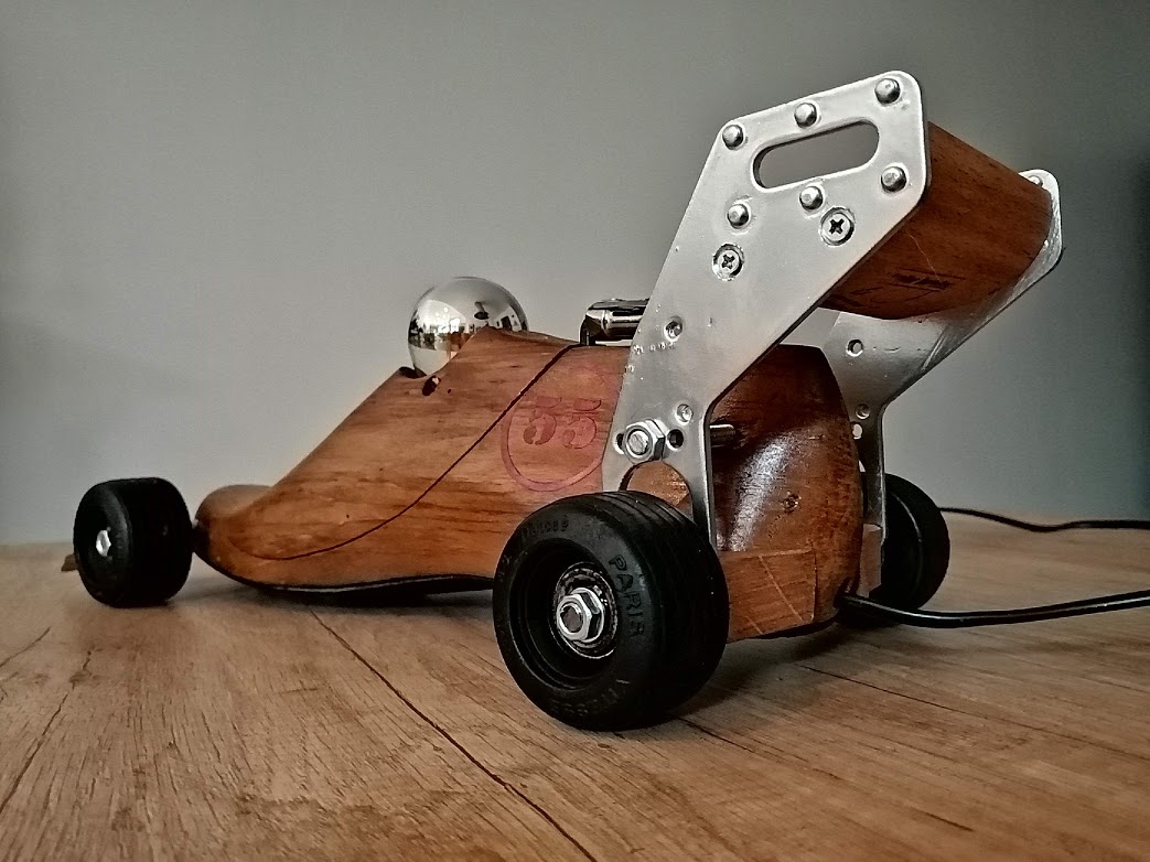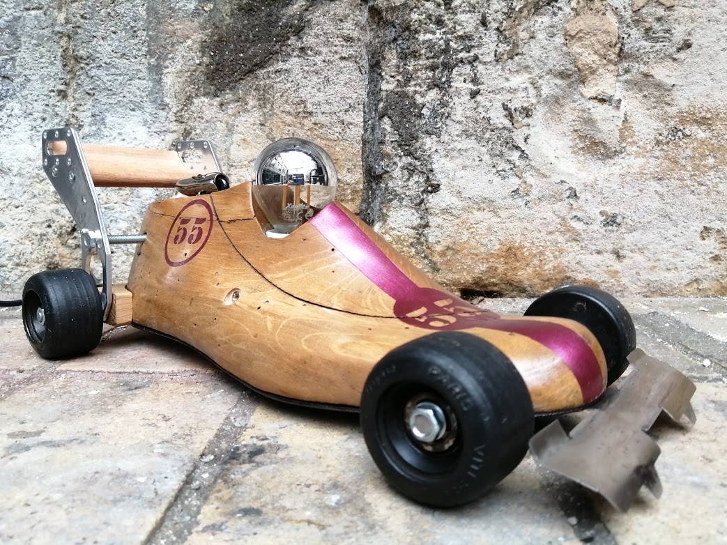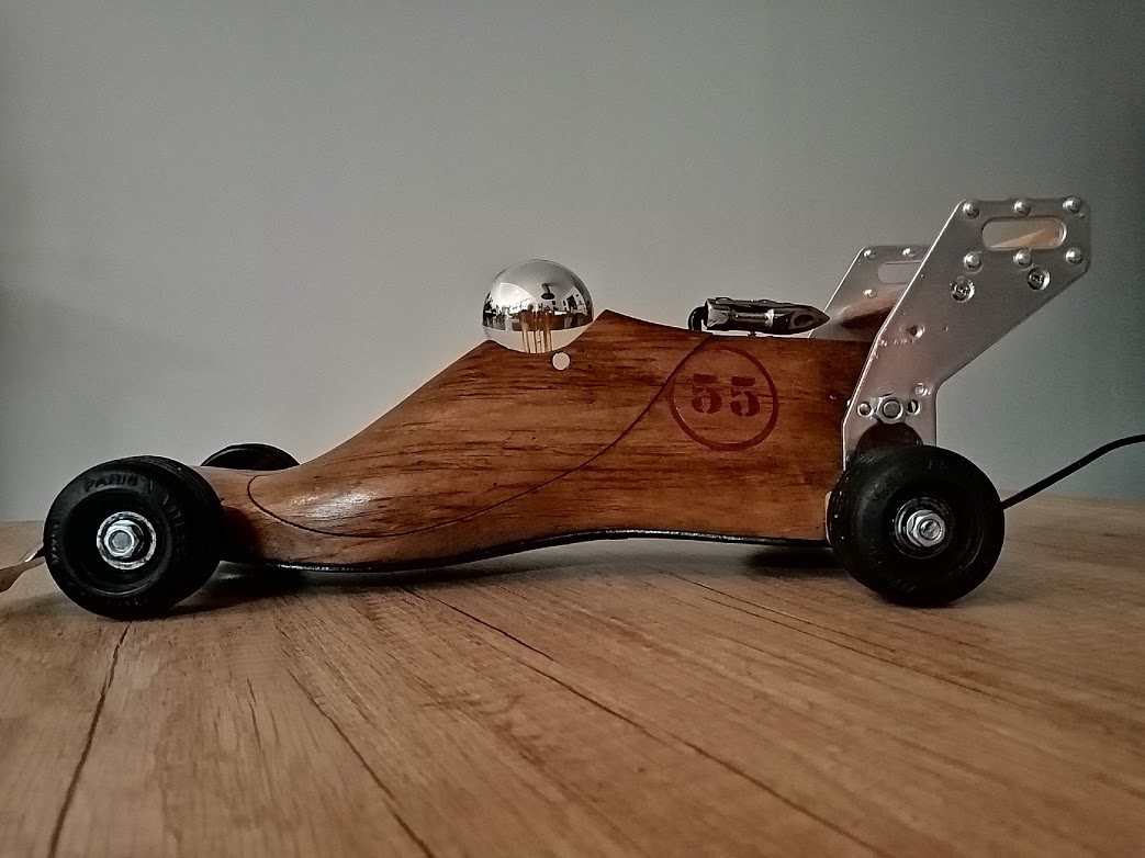 A partir d’une ancienne forme à chaussure en bois, nous avons, cette fois-ci, créé une voiture de course.