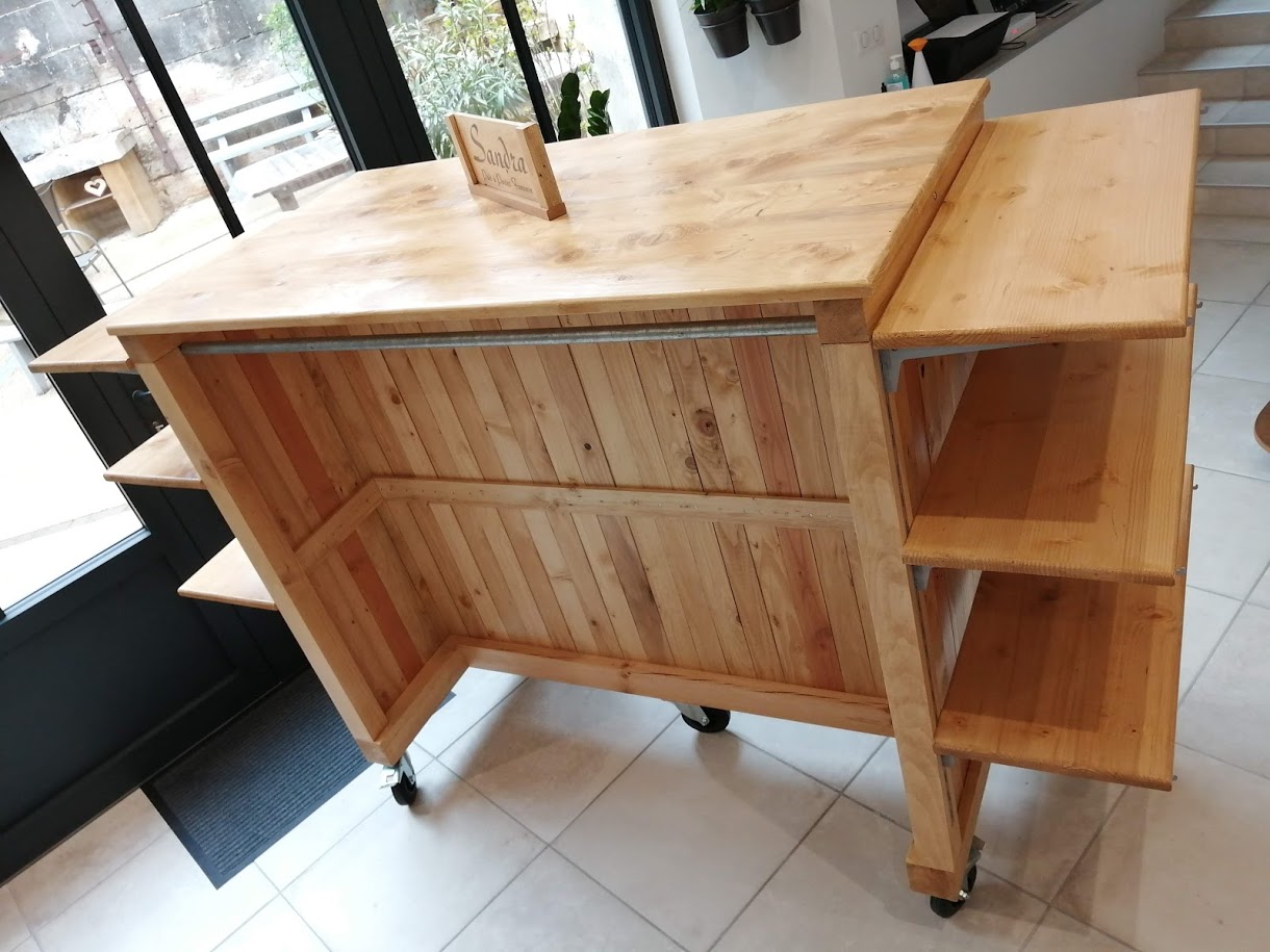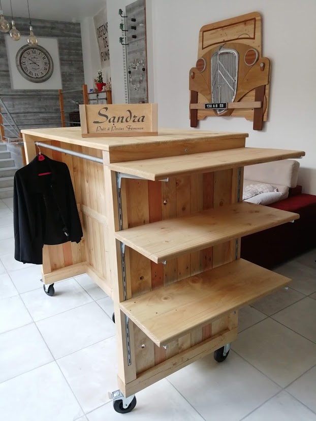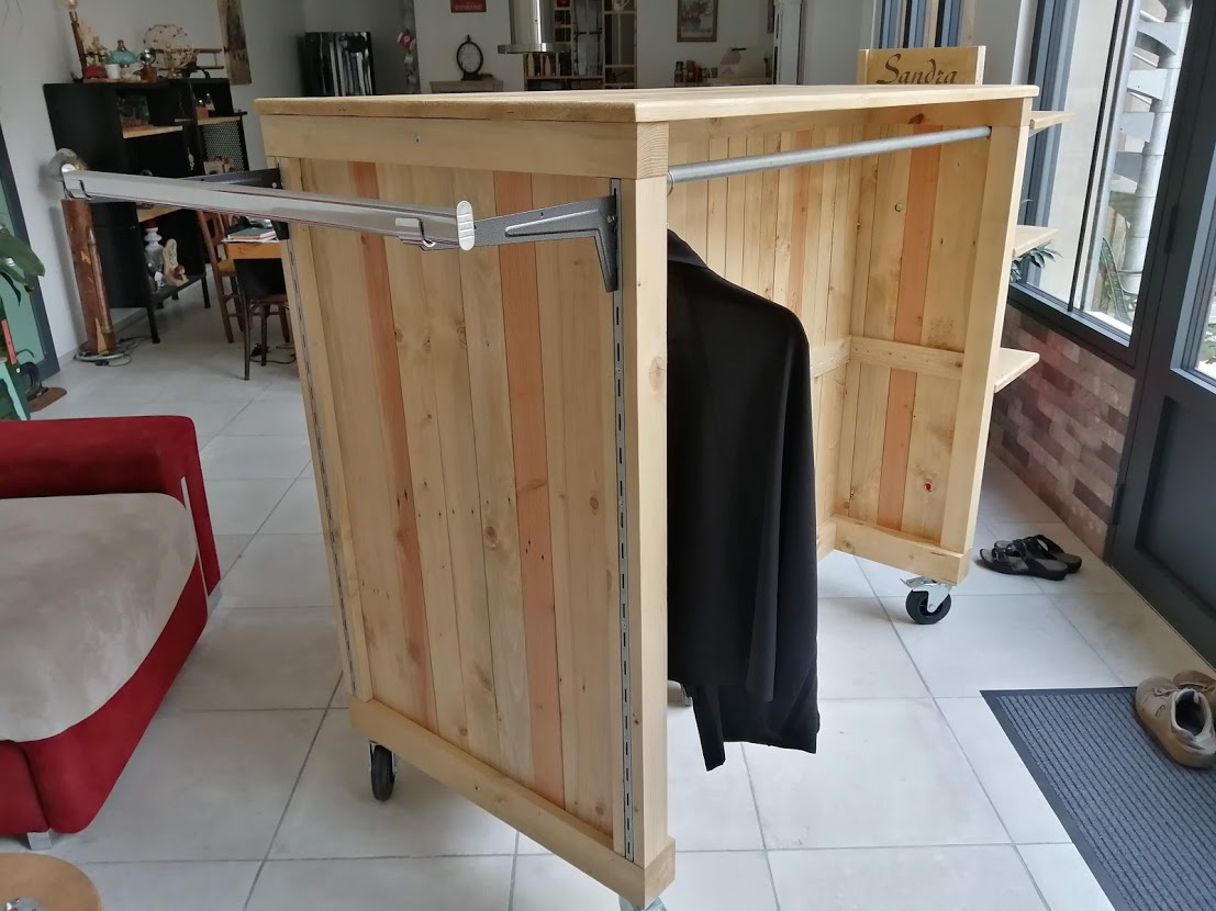 Sandra nous a demandé de créer un présentoir central afin d’exposer un maximum de vêtements dans un petit espace. Composé de 2 portants parallèles, ce présentoir sur roulettes peut accueillir, à chaque extrémité, des étagères mobiles ou un portant supplémentaire, le tout étant recouvert par un grand plateau.