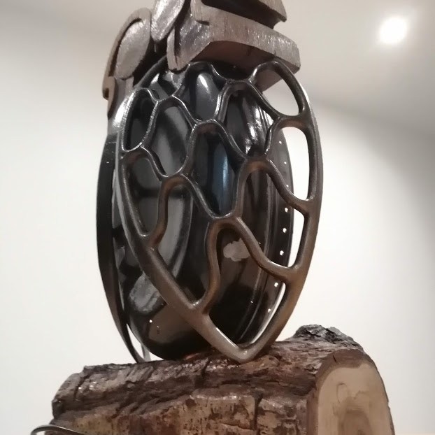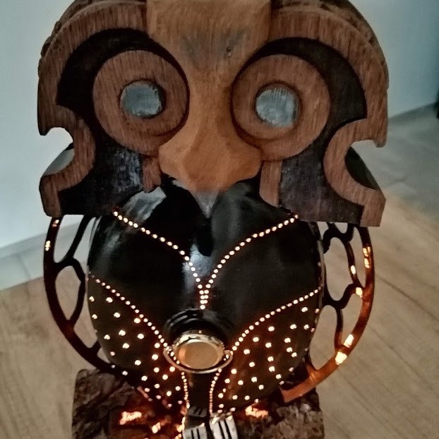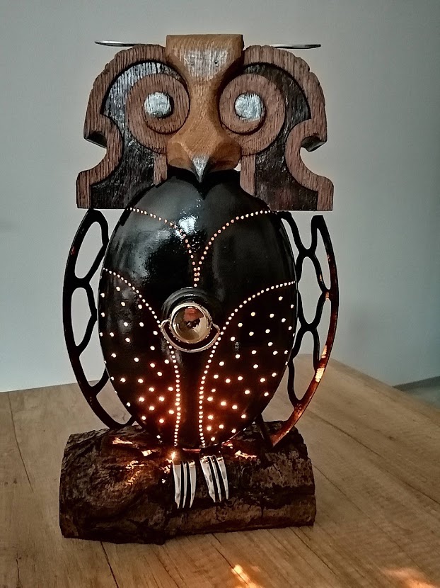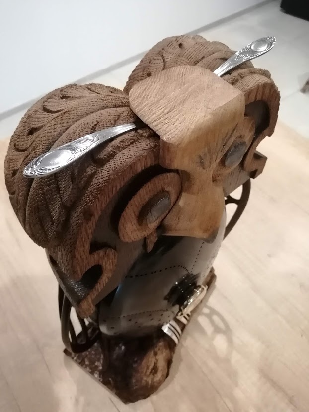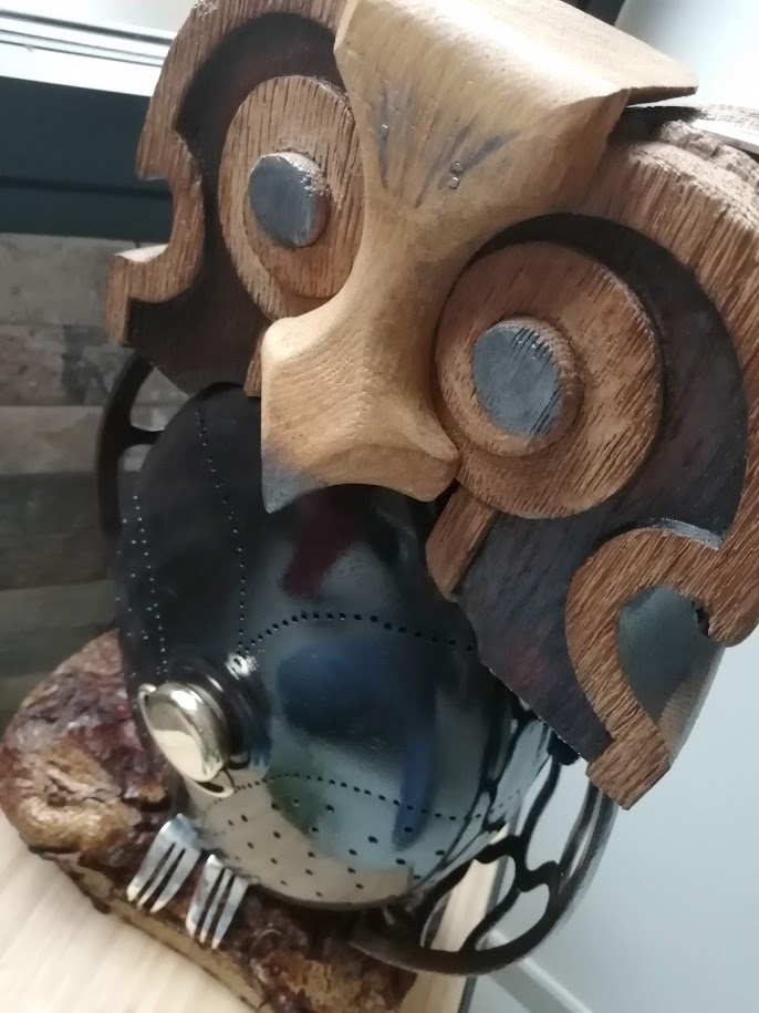 Son corps est une ancienne bouillotte en métal, ses ailes sont des protège-courroie de machine à coudre, ses pattes sont des fourchettes en argent et sa tête est formée à partir de pieds de table en chêne.