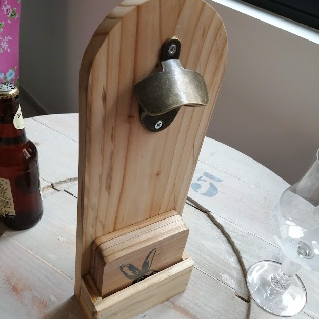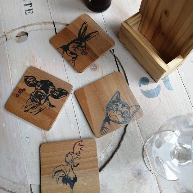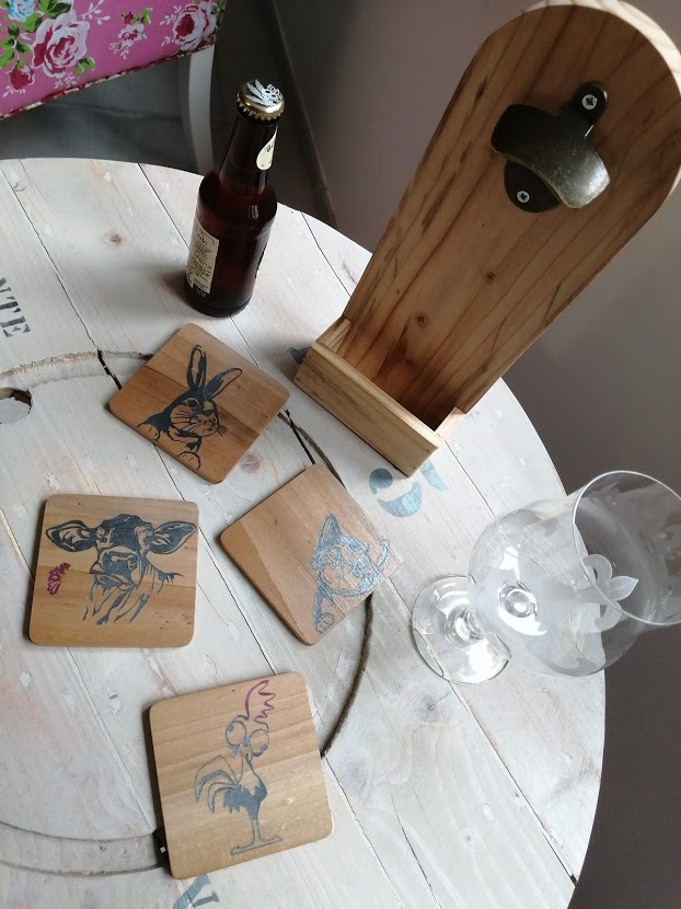 Série cœurs, animaux ou motifs géométriques, chaque lot comporte 4 sous-bocks de 10 cm sur 10 cm auquel il est possible de rajouter le support avec décapsuleur.