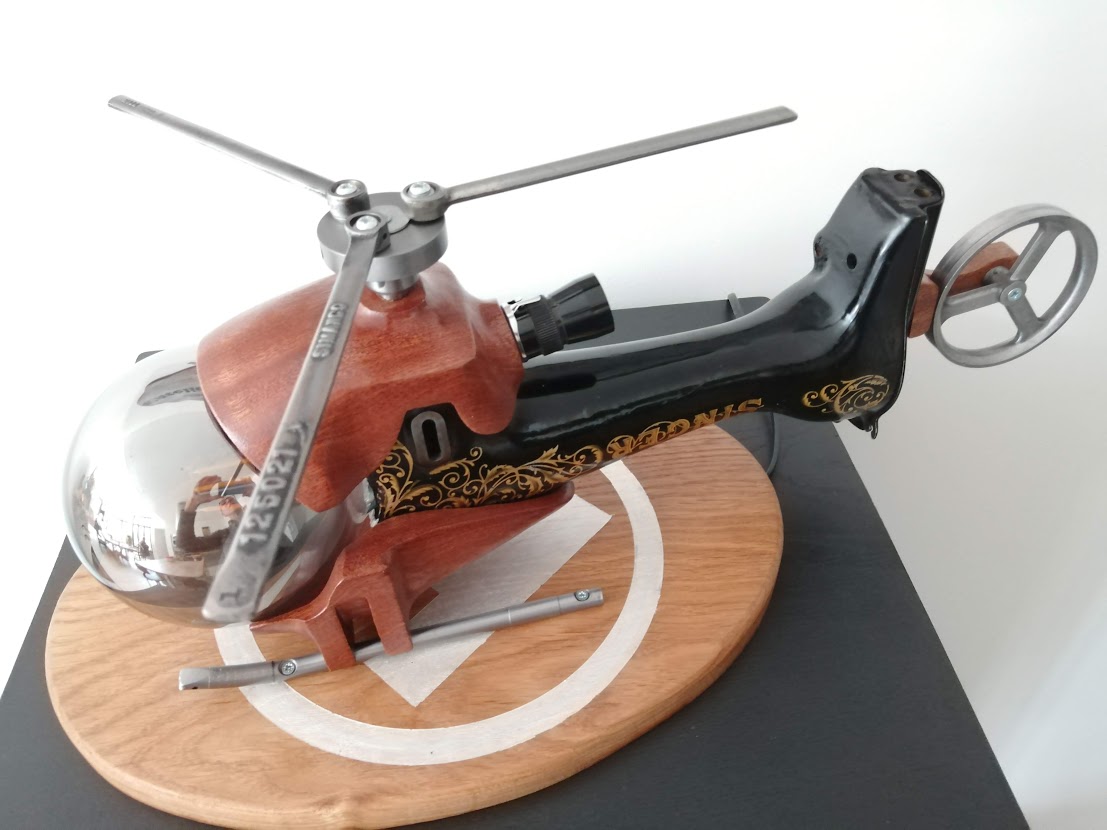 Hybride entre la Gazelle et l’Alouette, cet hélico improbable est entièrement réalisé avec des pièces de machine à coudre et du bois recyclé sculpté.