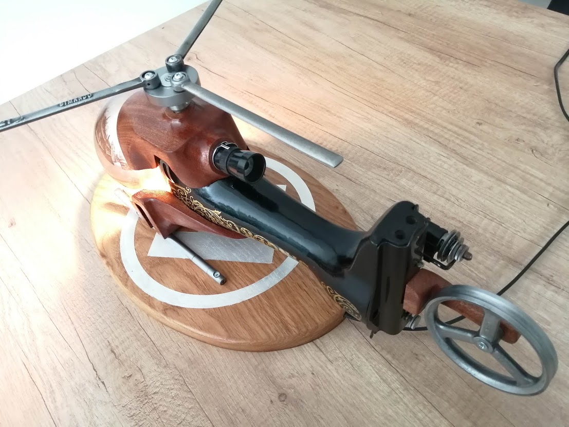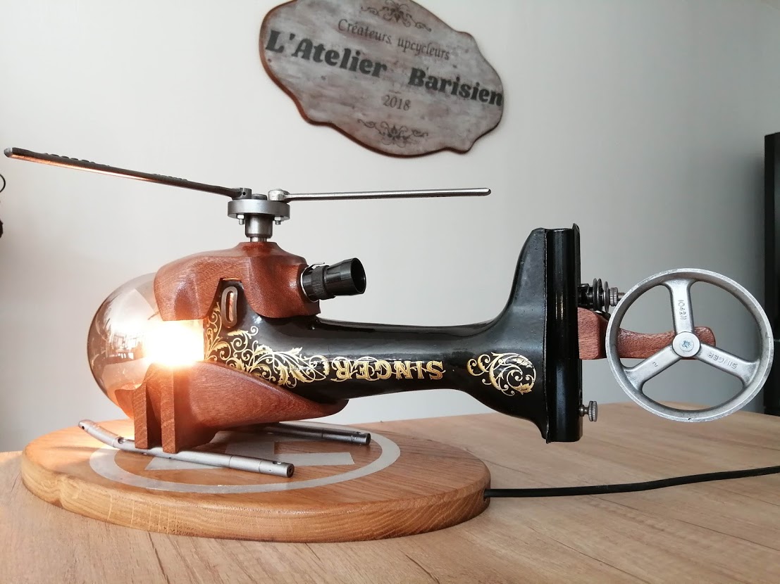 Pour les fans de machine à coudre ancienne, d’hélicoptère ou de déco originale, unique et éco-responsable, voici LA création à avoir chez soi.