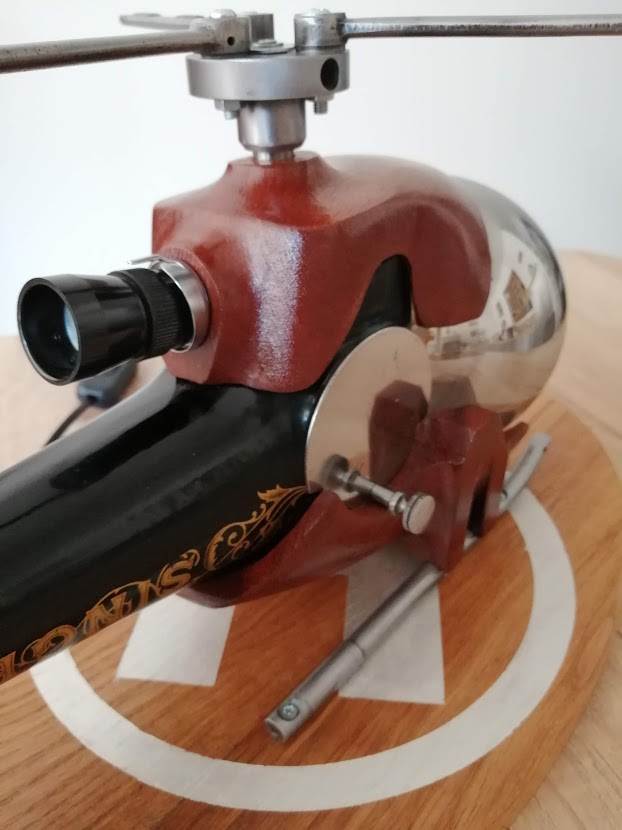 Posé sur son héliport, cet « Héli-couture » a tout d’un grand avec ses 3 pales mobiles, son rotor arrière et sa turbine. Cerise sur le gâteau, la cabine est une grosse ampoule LED permettant un éclairage d’ambiance.