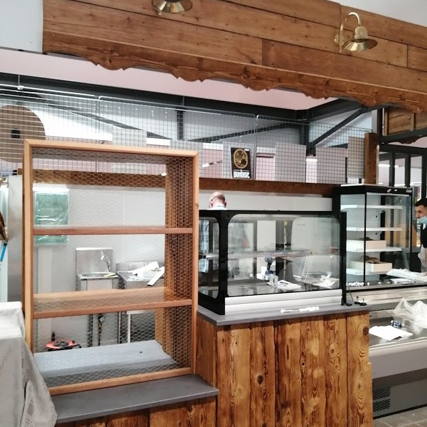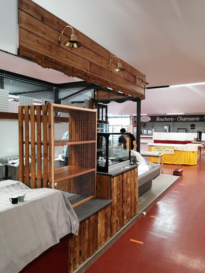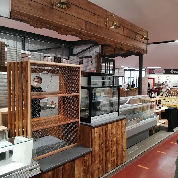 Pour la vente de ses produits locaux, notre crémier a besoin de plans de travail, de frigo et d’étagères. Pour cela, c’est un 1er module sur mesure que nous avons créé pour intégrer l’étagère réfrigérée.