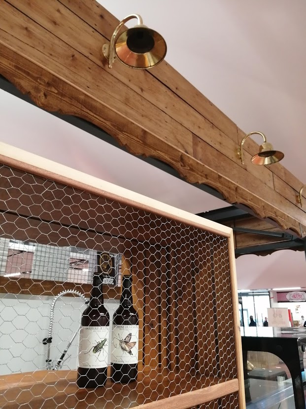 La face avant de l’étagère en bois est recouverte d’un grillage à poules pour un aspect très « grenier ». C’est ici que les bières locales vont prendre place.
