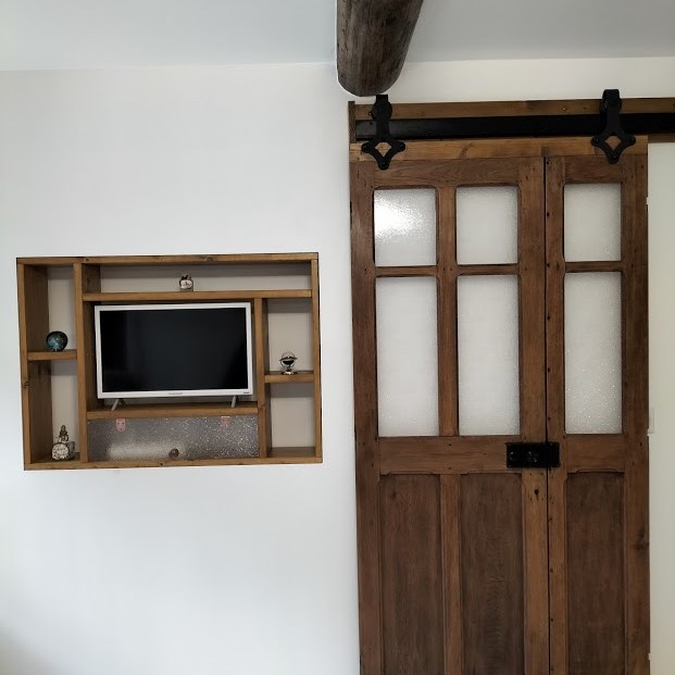 Pour cette chambre, nous avons pris le parti de recycler une ancienne porte d’entrée en chêne pour une utilisation en porte coulissante.