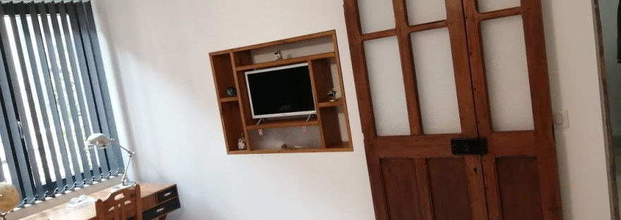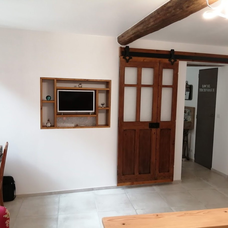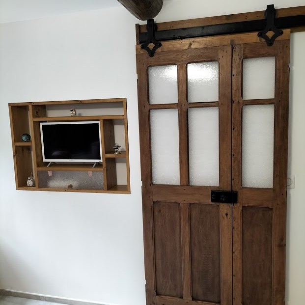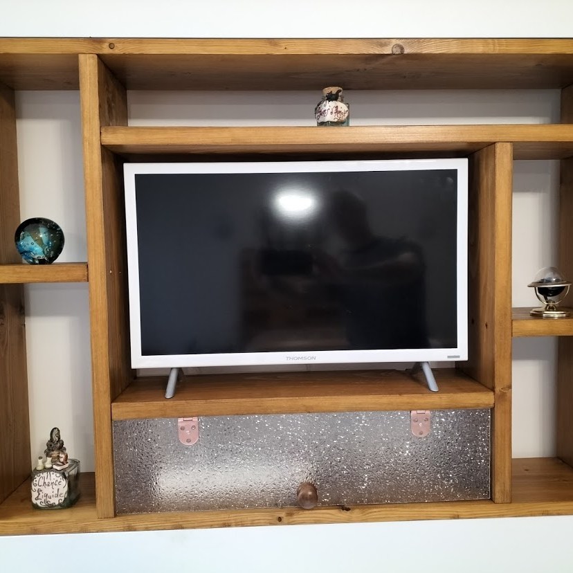 Et pour sublimer le coin télé, une petite claustra dans le même style avec une porte sur charnière en plexi pour cacher les fils électriques.