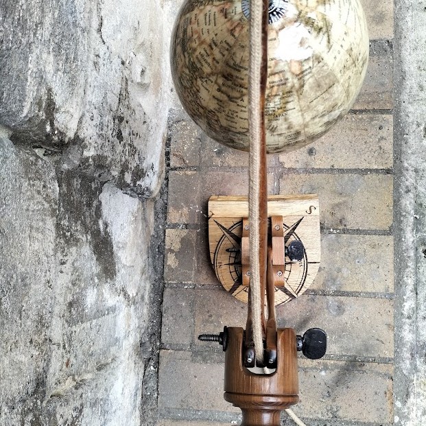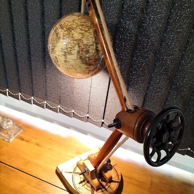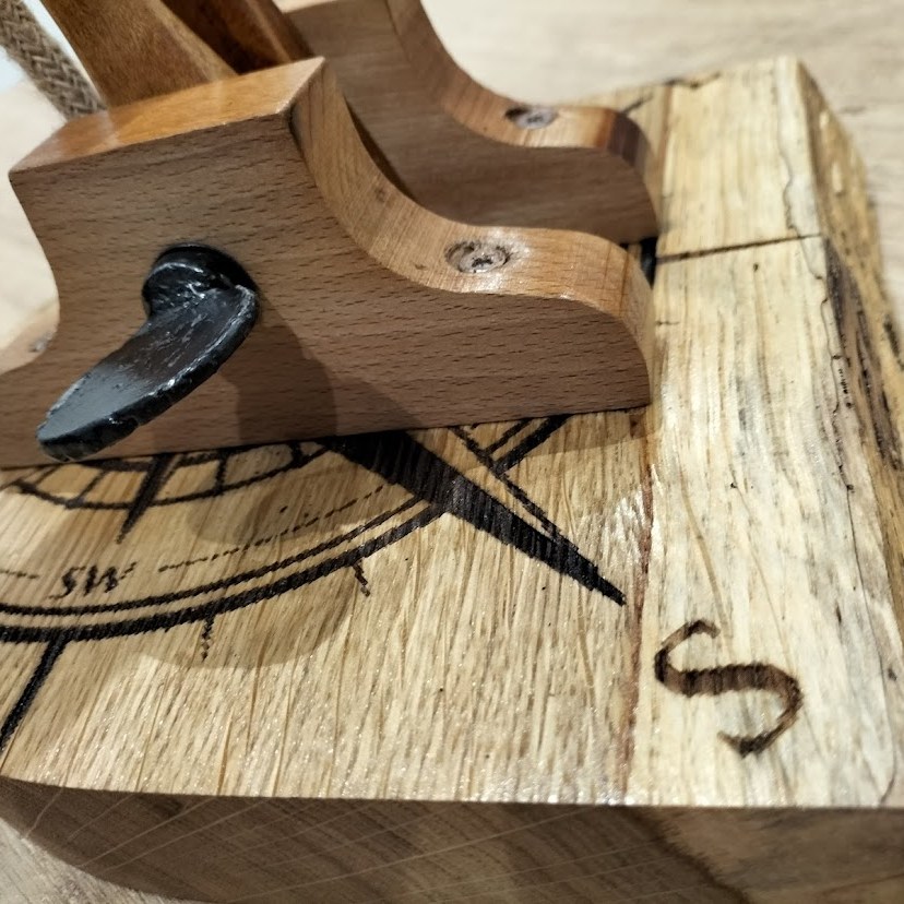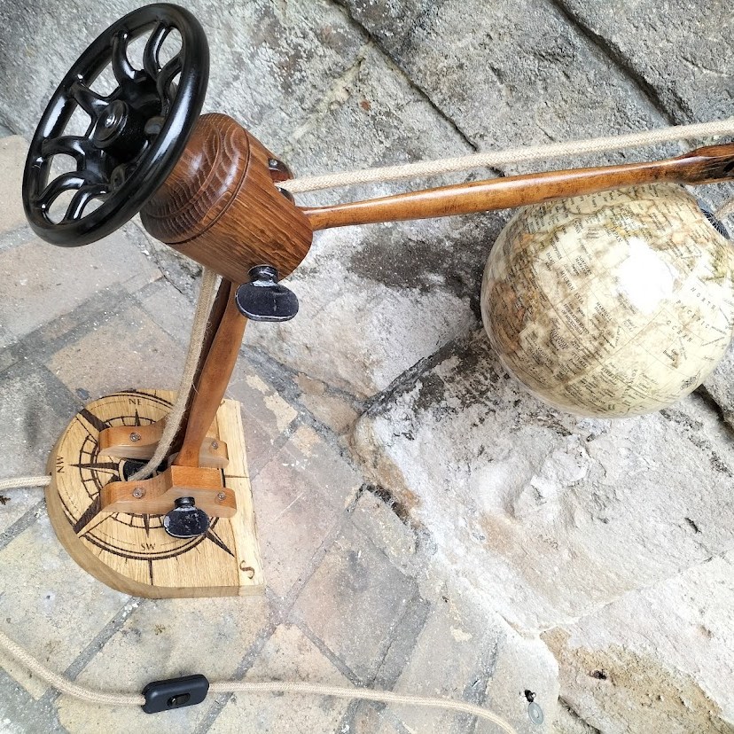 Nous lui avons ajouté un socle en chêne sur lequel est gravé une belle rose des vents et, en guise de gouvernail, un volant de machine à coudre.