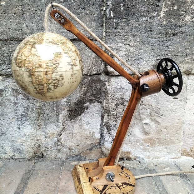Les vacances, le soleil( bon, pas aujourd’hui), l’envie de voyage et nous voilà en train de créer la lampe du Capitaine. Les bielettes de pédalier de machine à coudre, en bois, patinées par le temps( elles datent de 1884) nous ont fait penser aux boiseries d’un bâteau.