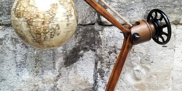 Les vacances, le soleil( bon, pas aujourd’hui), l’envie de voyage et nous voilà en train de créer la lampe du Capitaine. Les bielettes de pédalier de machine à coudre, en bois, patinées par le temps( elles datent de 1884) nous ont fait penser aux boiseries d’un bâteau.