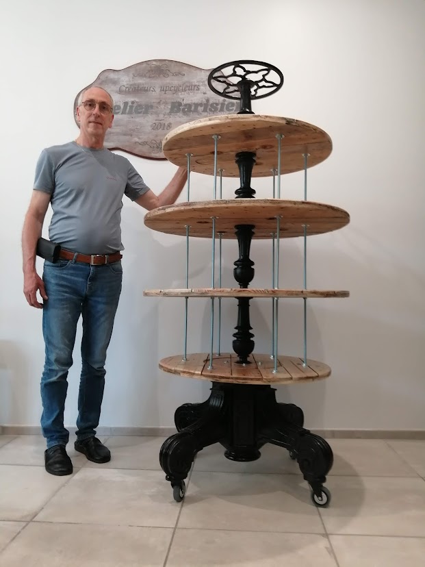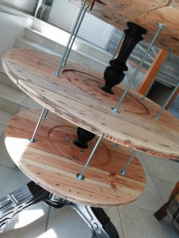 Nous avons mixé l’ancien (pieds de table en noyer et chêne) avec du contemporain( plateaux de touret et tiges filetées), le bois brut et le bois peint pour un carrousel très original.