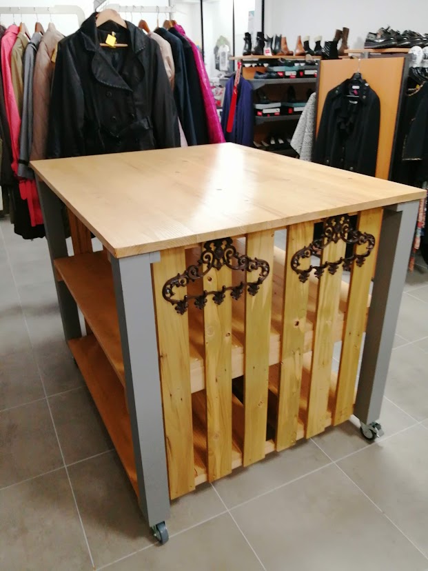 Le chariot, sur roulettes, a 3 niveaux et s’accorde parfaitement avec le reste du mobilier de la boutique.