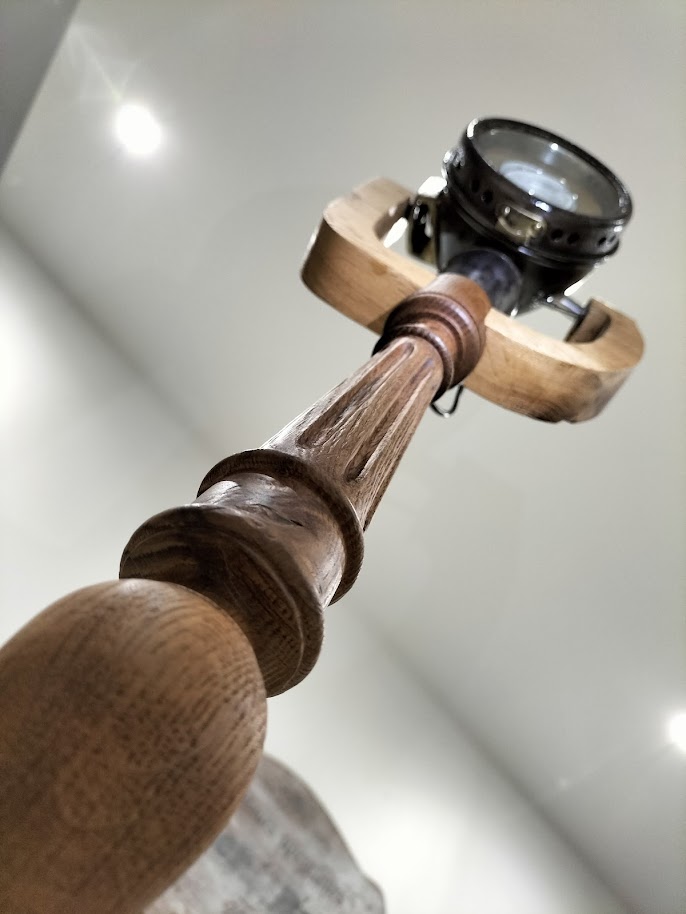 Pour le mettre en valeur, nous l’avons perché sur un volant de machine à coudre industrielle et un pied de table en chêne. Et pour le maintenir, nous avons sculpté un étrier.