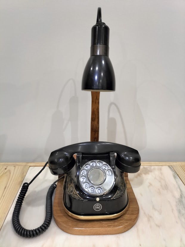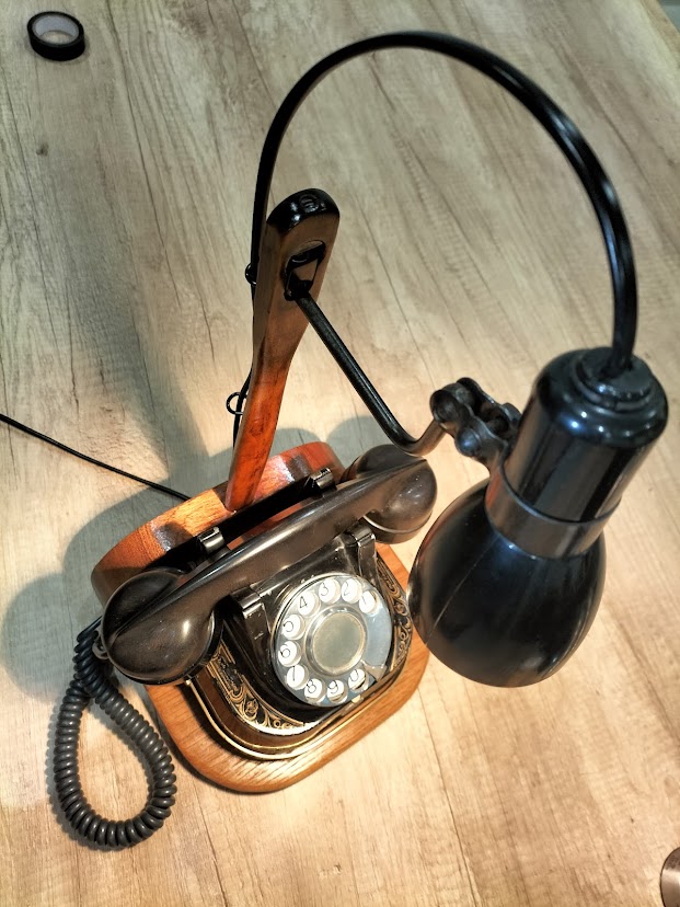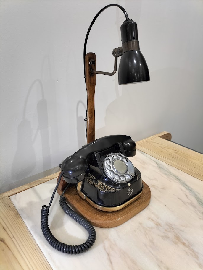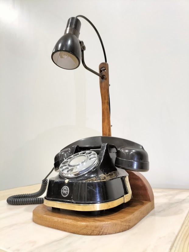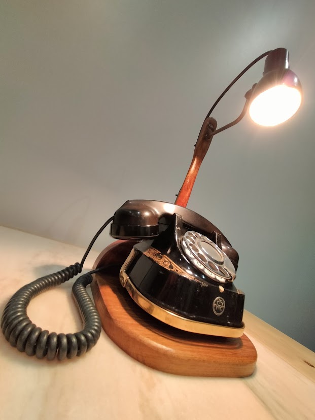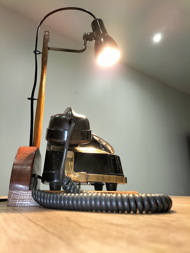 Posé sur un socle en bois recyclé, le téléphone est surmontée de sa lampe orientable, parfaite pour éclairer vos longues soirées d’hiver.