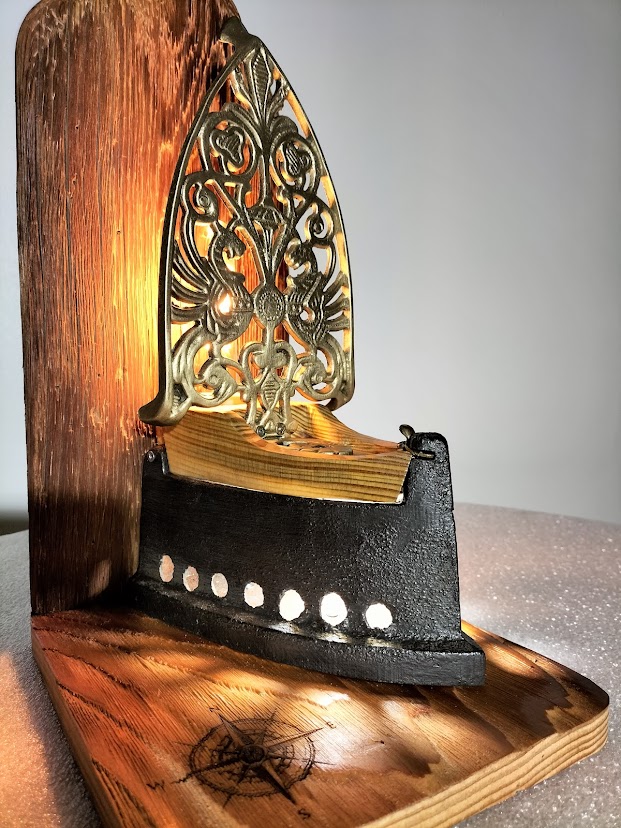 Pour créer cette nouvelle lampe, nous sommes partis d’un ancien fer à repasser à braises auquel nous avons rajouté un magnifique repose-fer ouvragé en guise de voile.