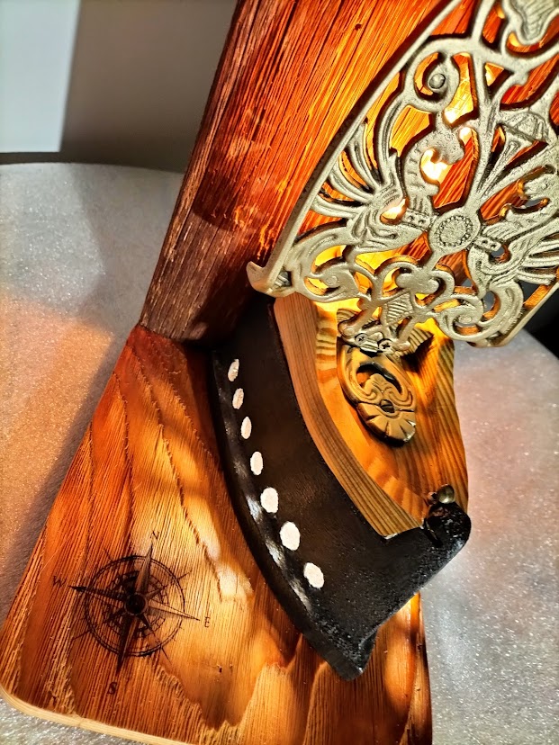 Le socle en bois est sculpté pour simuler les vagues et une rose des vents est gravée.