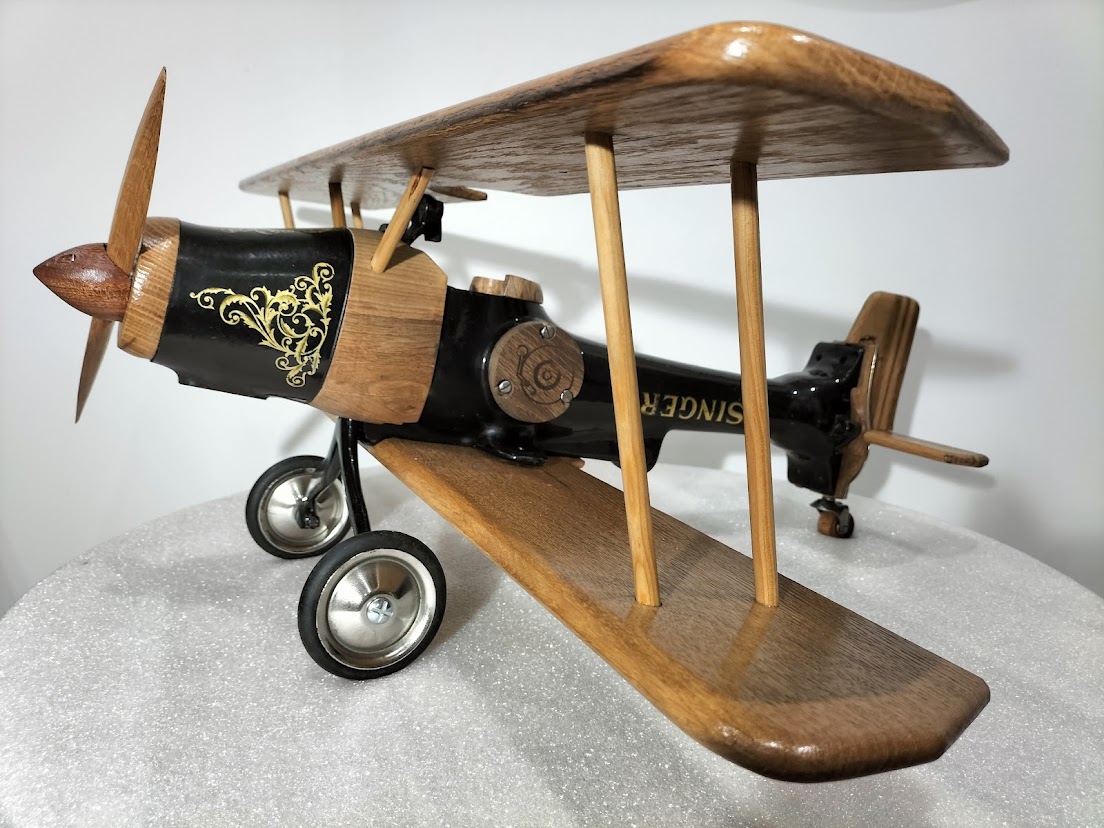 Créé à partir de 2 anciennes machines à coudre dont une de cordonnier, ce biplan a des mensurations XXL.