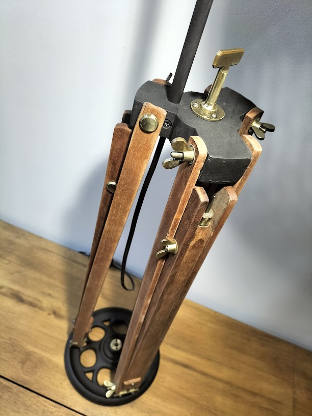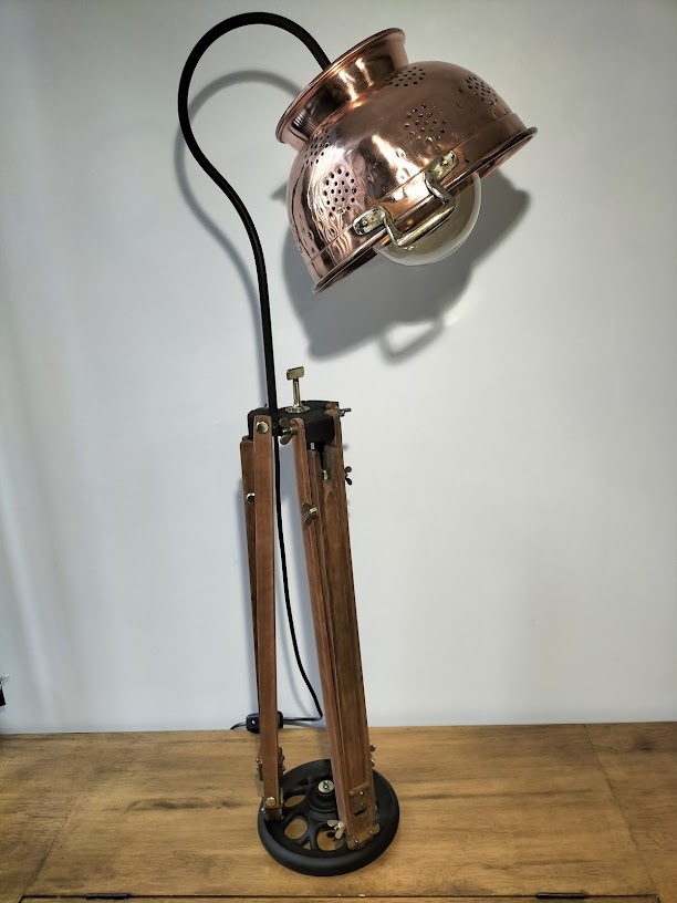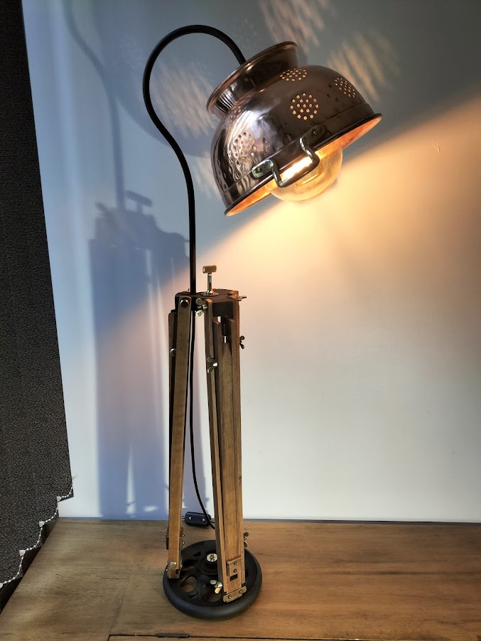 C’est un petit bijou que nous avons déniché….cet ancien trépied de géomètre en bois et cuivre( datant du début du 20ème siècle) nous a inspiré pour créer une nouvelle lampe.