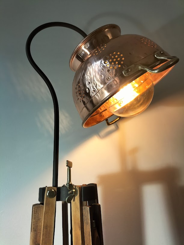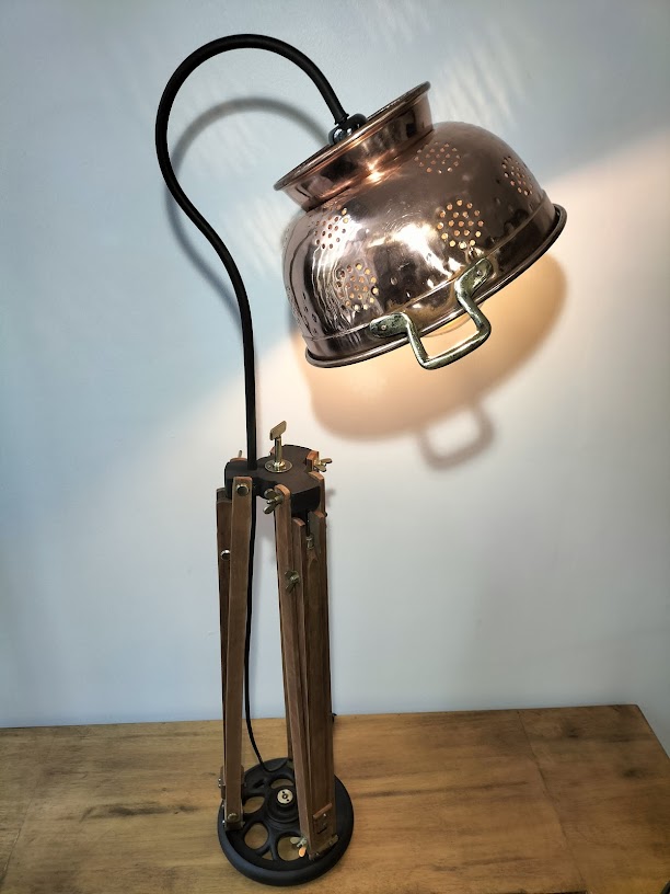 Posée sur un volant en fonte de machine à coudre, le trépied replié est surmonté d’une ancienne passoire en cuivre rose.