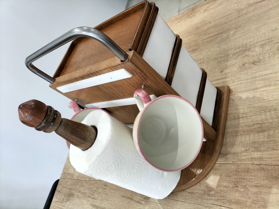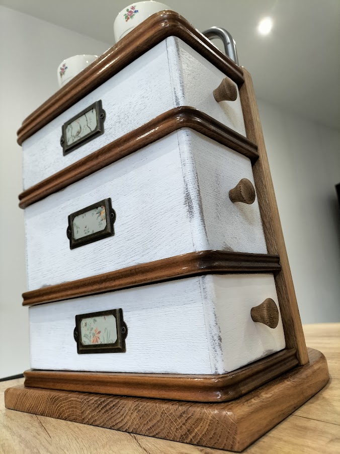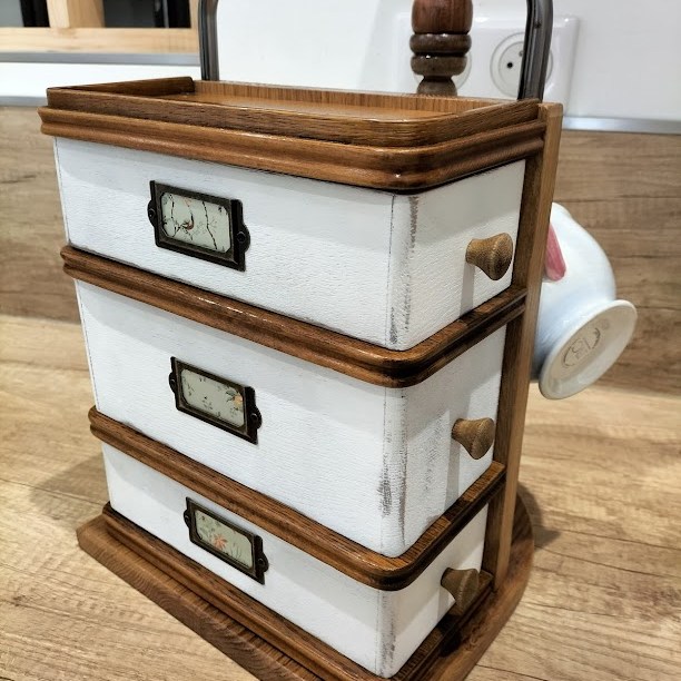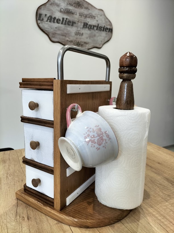 Les 3 tiroirs, de tailles différentes, vous permettront de ranger tubes à épices, thé, capsules de café… tandis qu’à l’arrière, le rouleau d’essuie-tout sera à disposition. Petit plus, les 2 crochets pour les tasses.