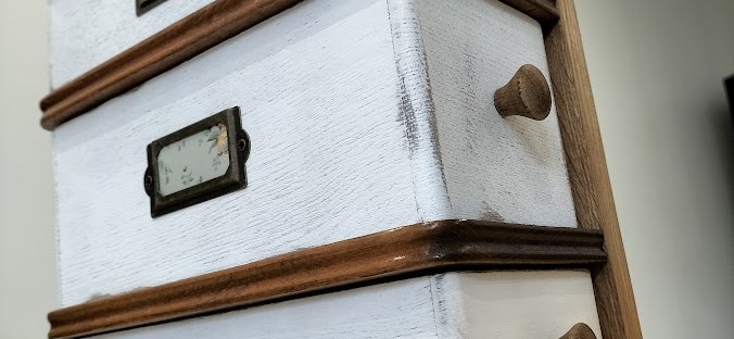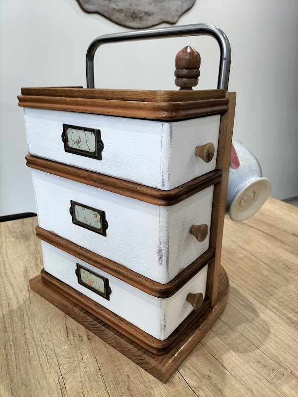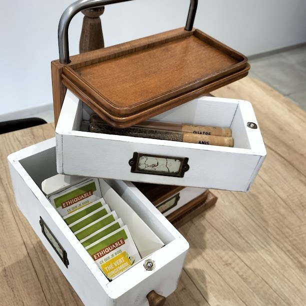 Créé à partir de tiroirs de machine à coudre et de bois recyclé, cet ensemble vous permettra d’avoir un plan de travail organisé.