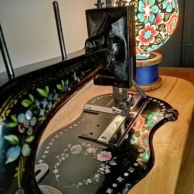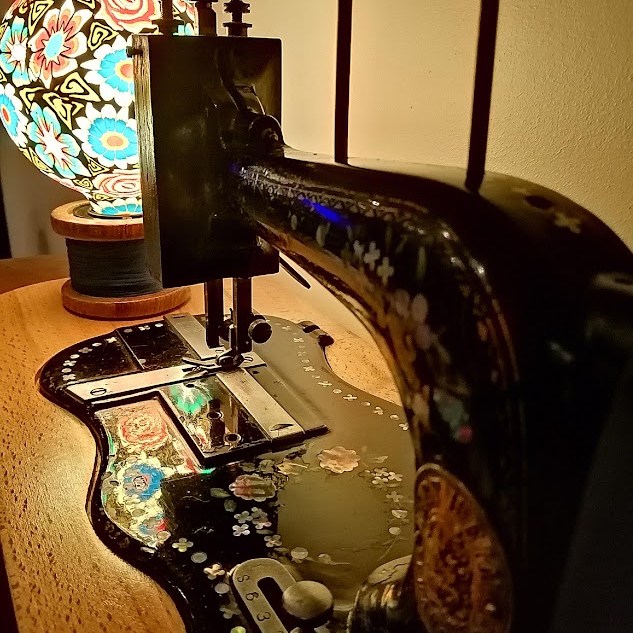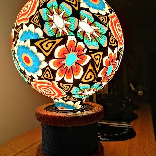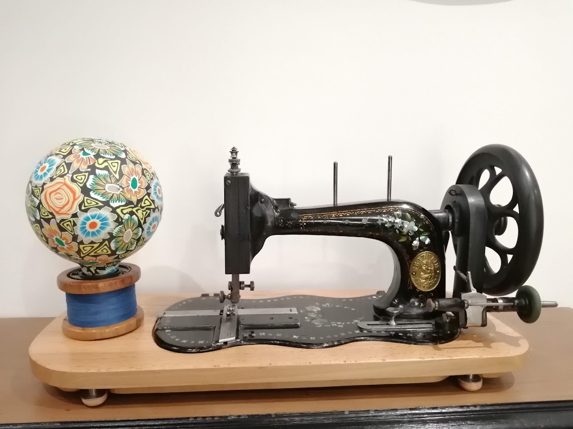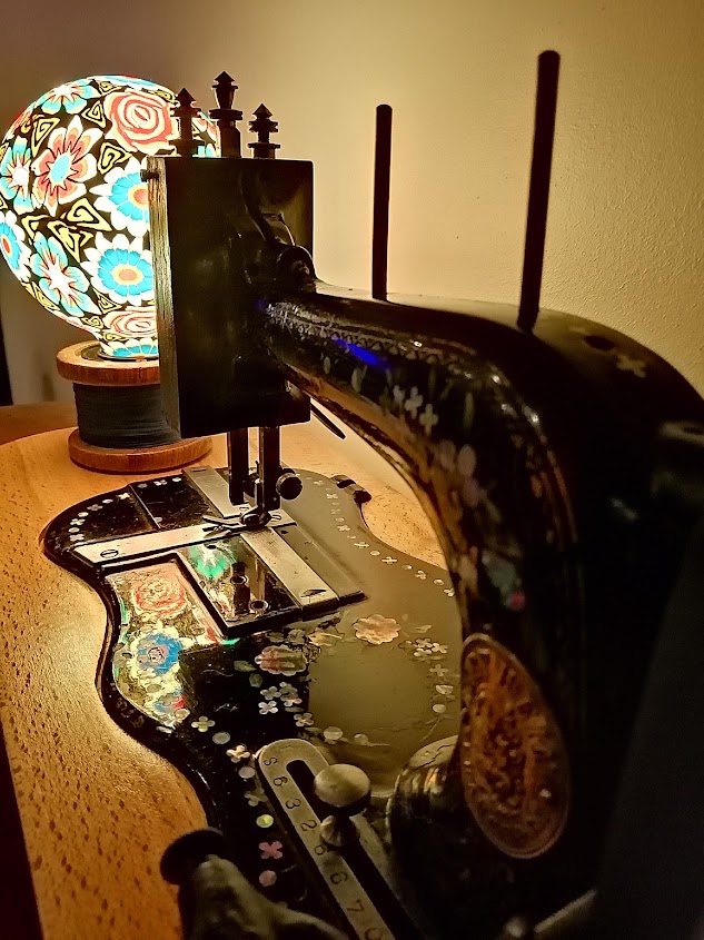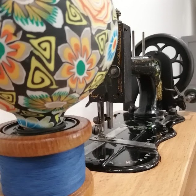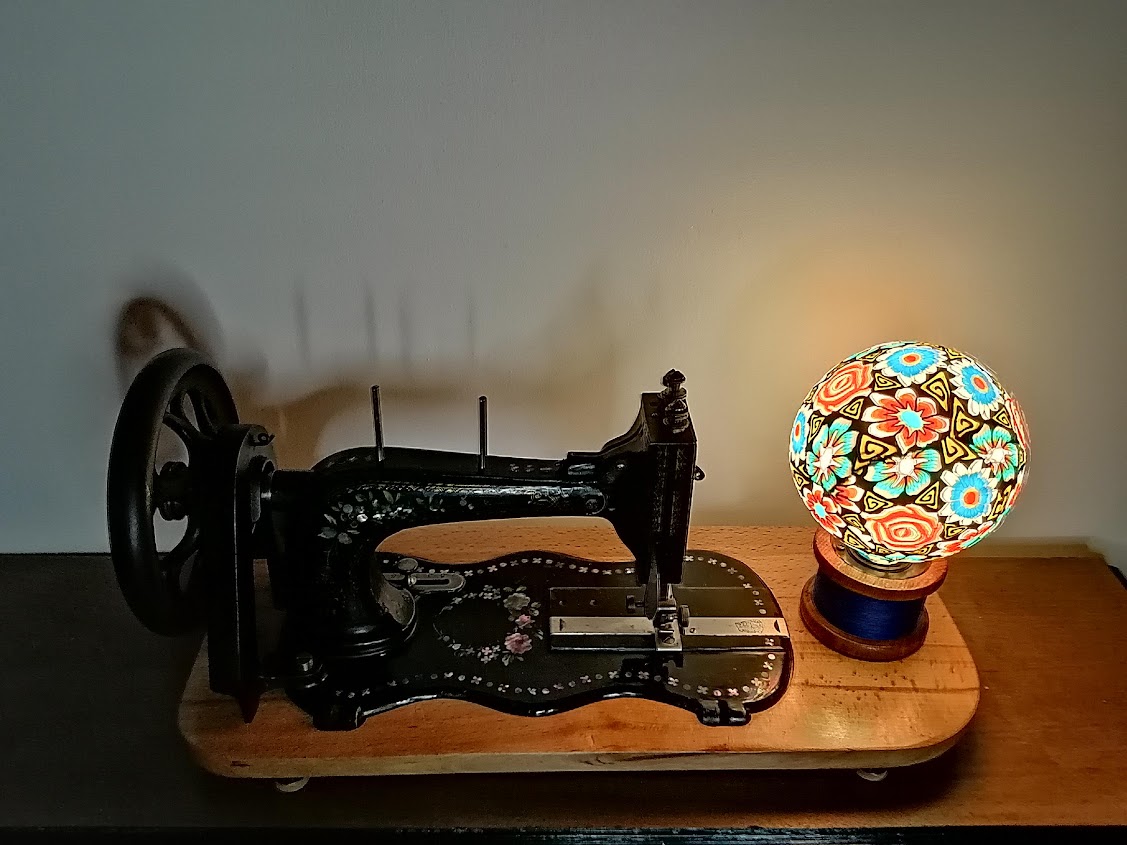 Posée sur un plateau de hêtre avec des pieds en canette de machine à coudre, nous lui avons ajouté une grosse bobine de fil bleu surplombée d’une ampoule LED aux fleurs bleues.