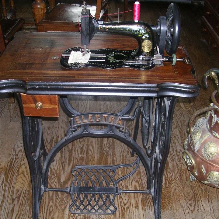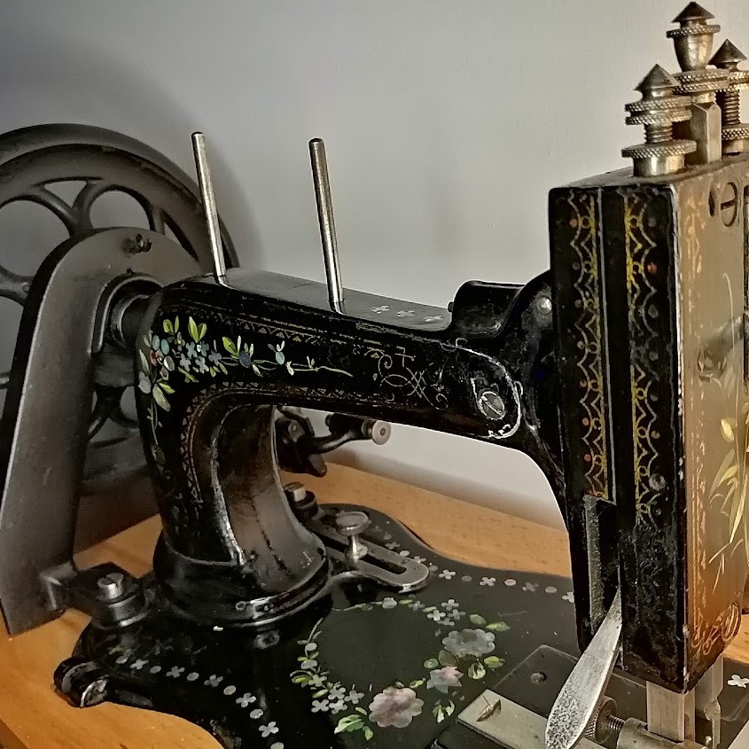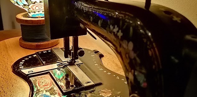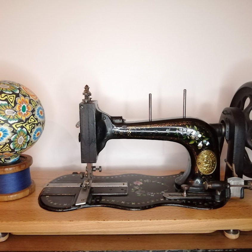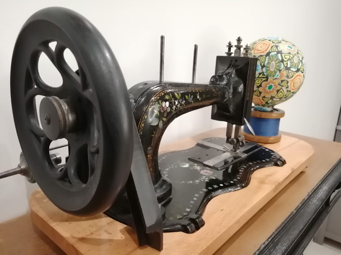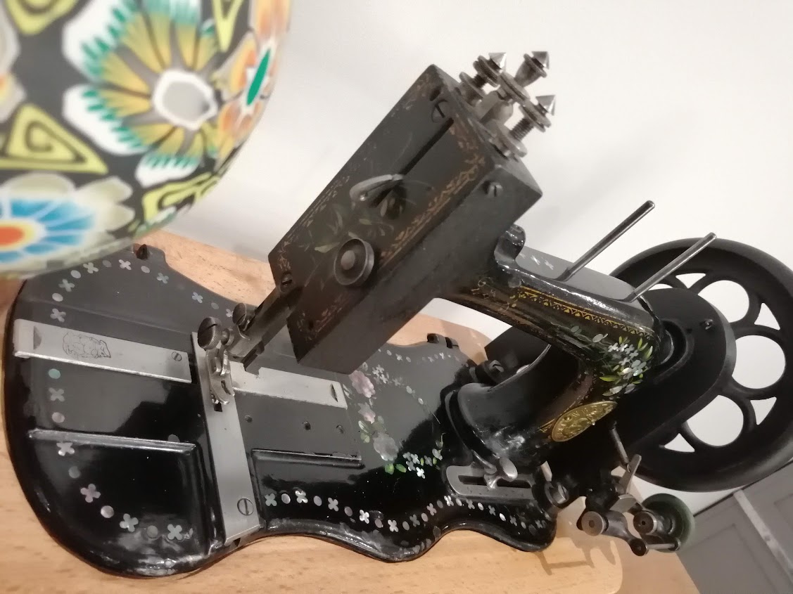 Posée sur un plateau de hêtre avec des pieds en canette de machine à coudre, nous lui avons ajouté une grosse bobine de fil bleu surplombée d’une ampoule LED aux fleurs bleues.