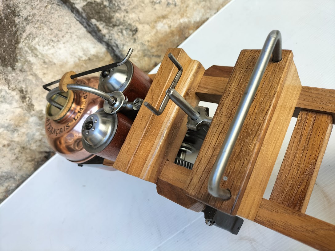 Bien entendu, c’est en mode upcycling que nous avons créé ce fardier. Pièces de machine à coudre, bois recyclé et pulvérisateur en cuivre composent l’engin.
