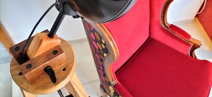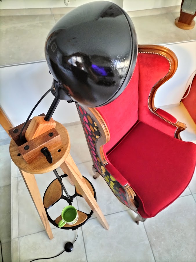 Posé sur un trépied en hêtre, le phare est orientable pour permettre la lecture.